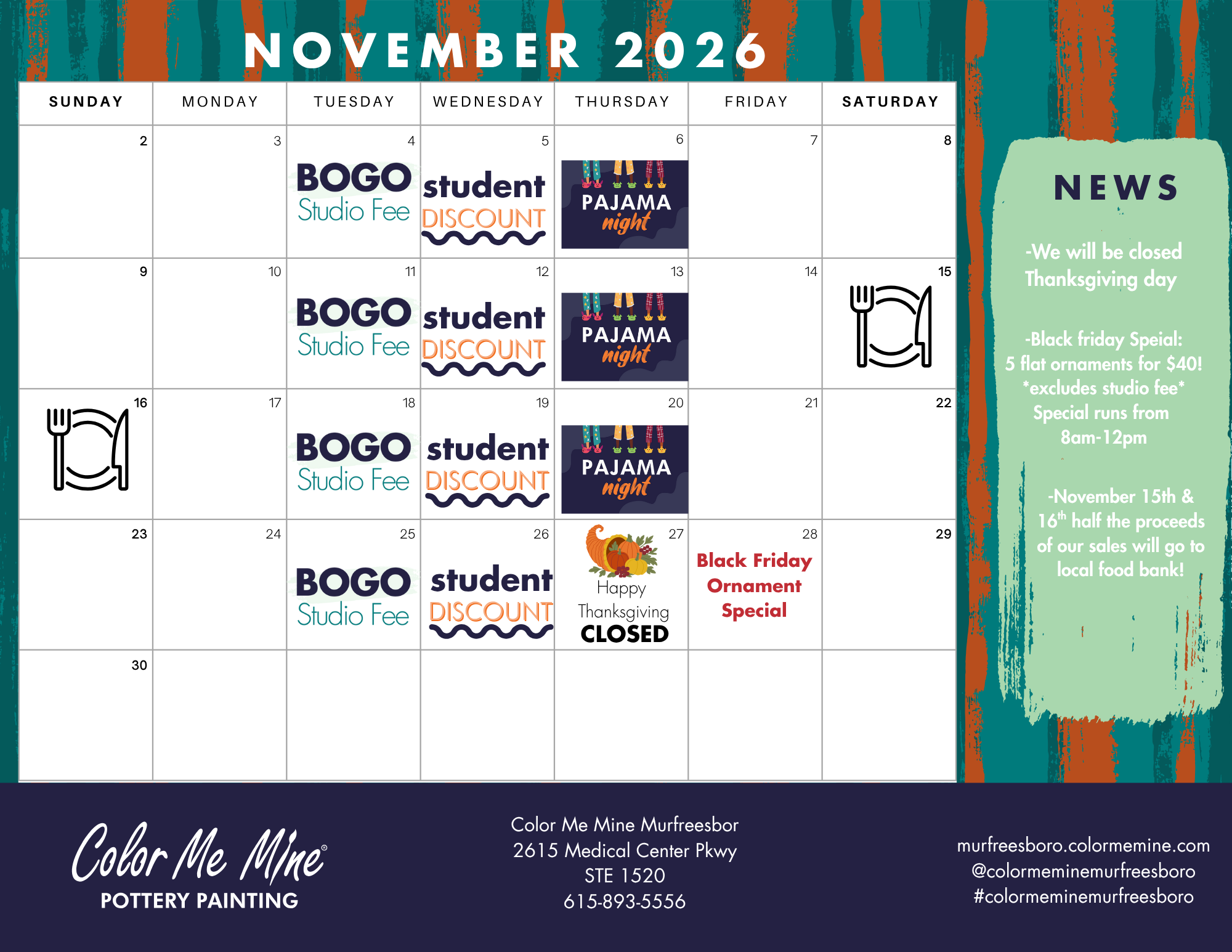 Closed Easter, Thanksgiving & Christmas Day, Open 10am-6pm Halloween Day **We will be closing early Wednesday, November 19th at 6:30pm**