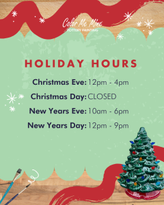 We are open 12-4pm Christmas Eve, Closed Christmas day, 10a-6pm NYE & 12-9pm New Years Day!